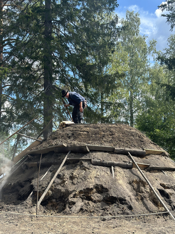Charcoal pile with volunteer checking top