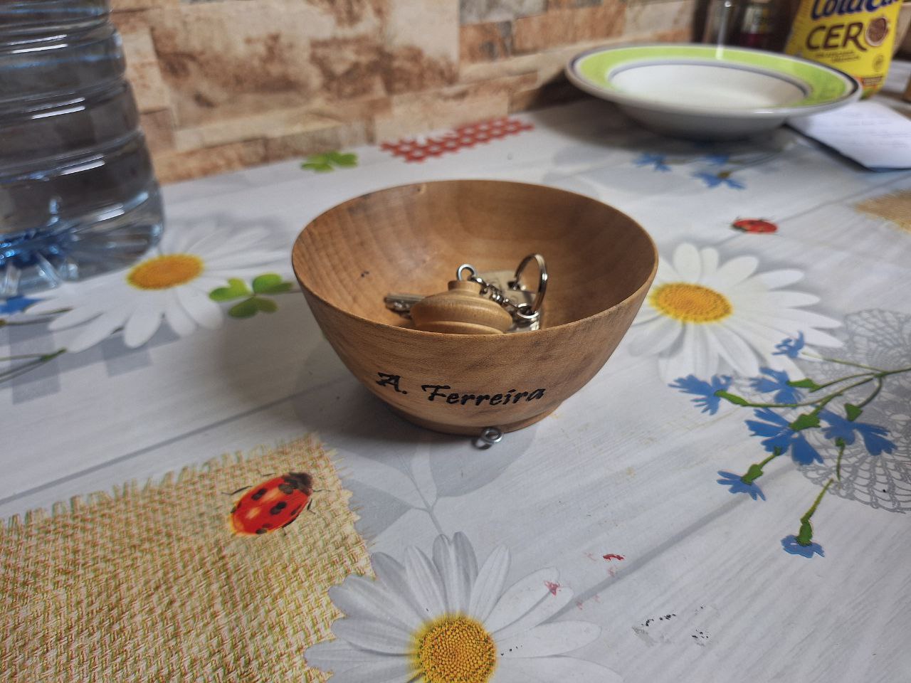 A wooden bowl (cachu) with an inscription "A. Ferreira" (side view)