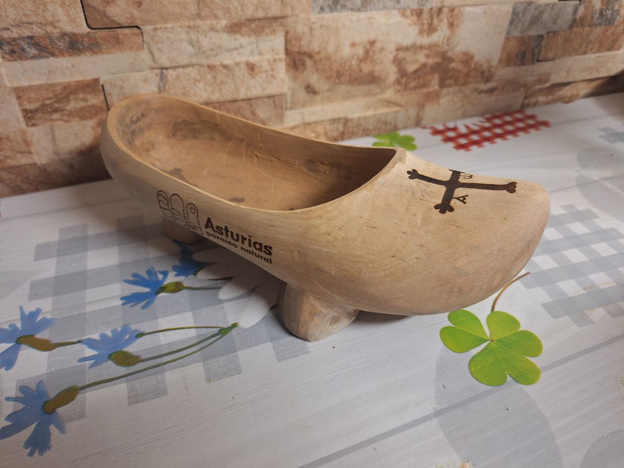 A wooden shoe (madreña) with an inscription "Asturias // paraiso natural" (three-quarter view)