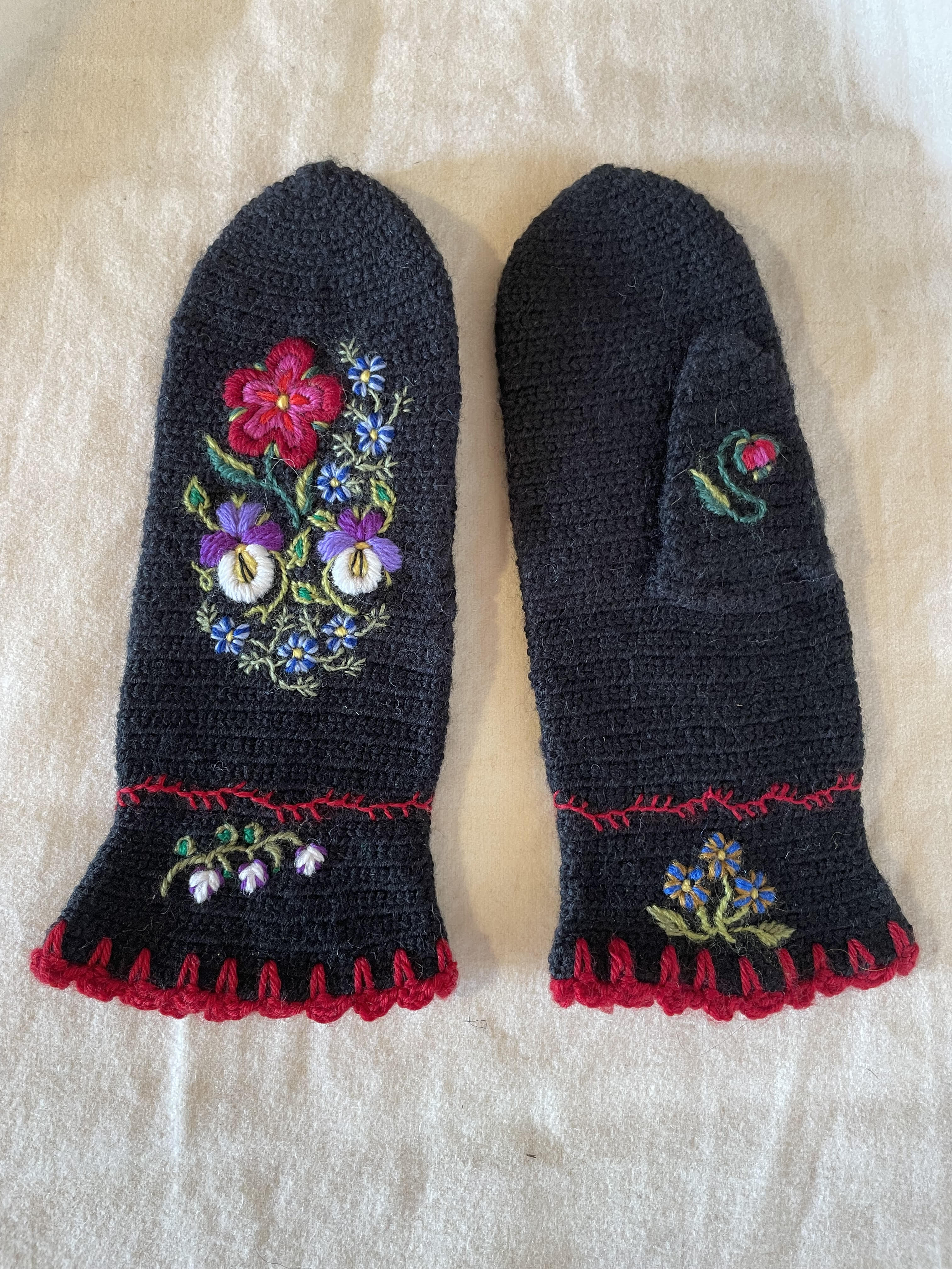 Pari of black nålbundna mittens in wool with embroided flowers