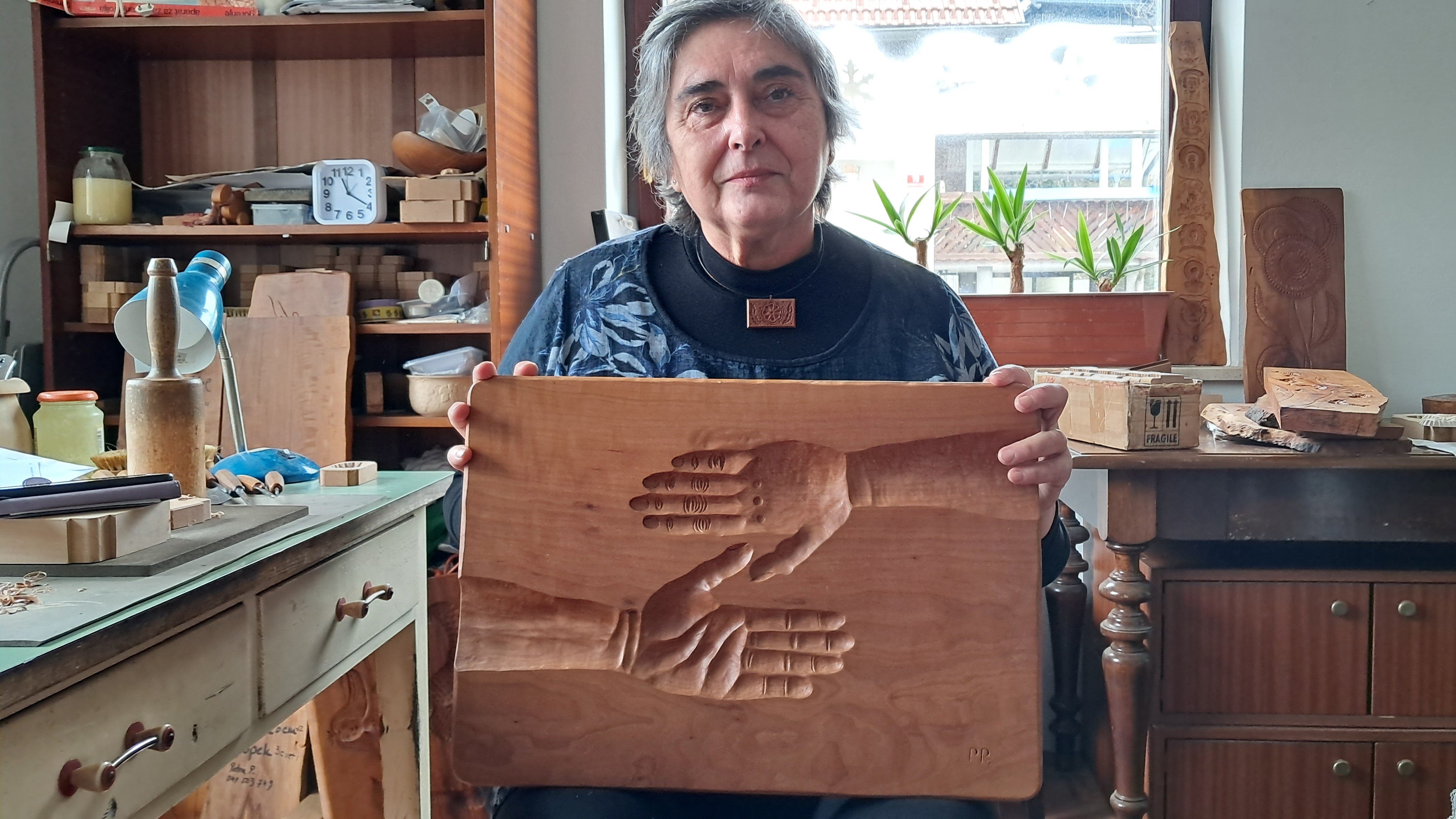 Petra Pletenjak Podlogar shows her products (carved relief) in her workshop.