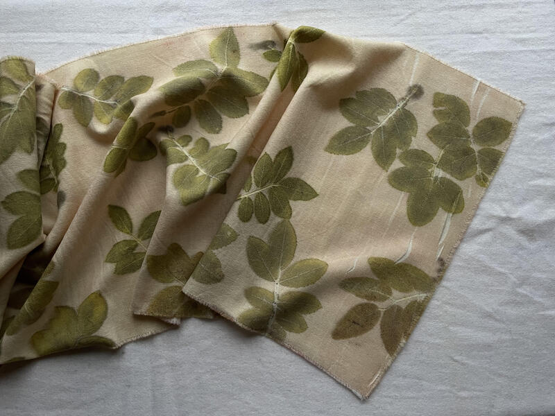 Woolen scarf in pale colour with patterns of darker leaves
